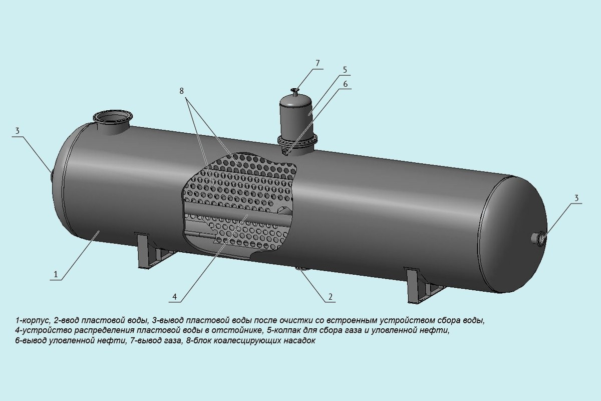 Для приема пластовой воды в установках подготовки нефти используют стальной цельносварной горизонтальный резервуар с эллиптическими торцами и днищем. Такая конструкция технологически обоснована для оптимизации процессов вывода, образующихся при очистке воды, отложений.