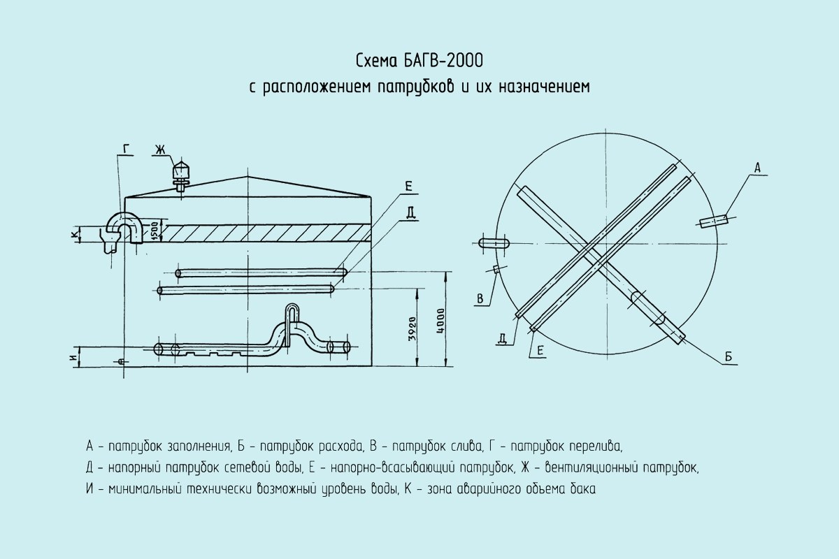Бак аккумулятор, для горячей воды, БАГВ-2000 м³ изготовляют по проектной документации, разработанной в соответствии с техническими нормами и правилами безопасной эксплуатации – по комплектам чертежей типовых проектов:
